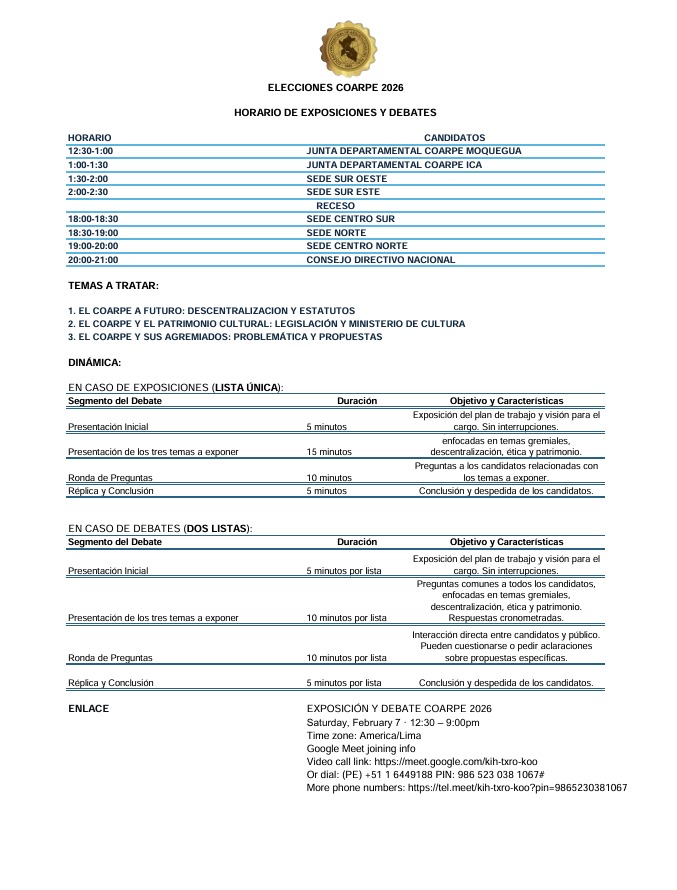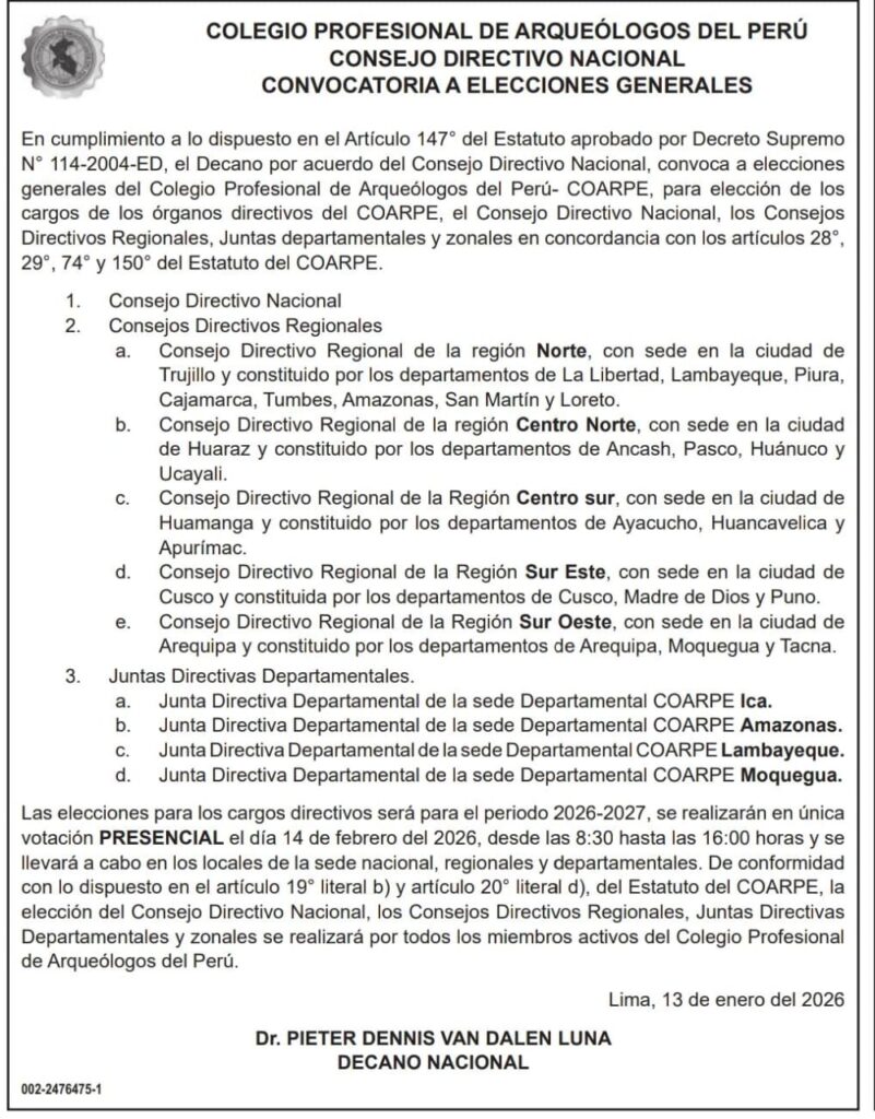 Para leer la proclamación electoral del Proceso electoral nacional, regional y departamental 2026 del Colegio Profesional de Arqueólogos del Perú dar click en el enlace siguiente: